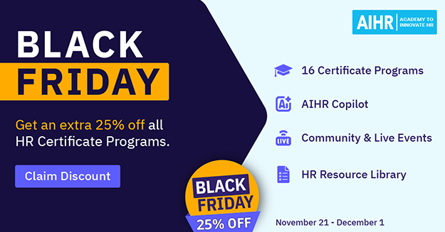 AIHR will be running their biggest sale of the year this Black Friday with an additional 25% discount on all their plans: Certificate Programs, Full Academy License and Team Licenses. Everything is 25% off ON TOP OF the regular 20% discount. The discount runs from November 21st – December 1st, 2025.
